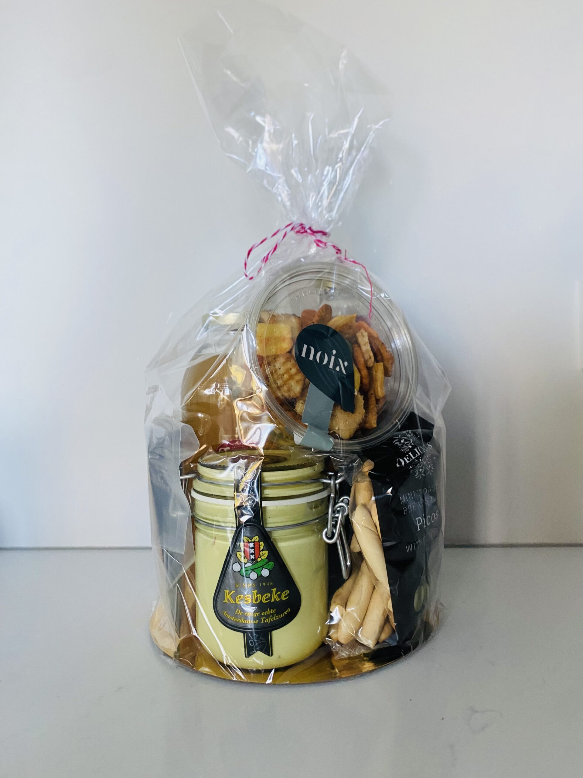 Een borrelpakket gevuld met een fles Cava de Pro, een fles Bon Remède Rose met daarbij heerlijke producten van Fruittuin Verbeek uit Oldebroek. De populaire picanaise van Kesbeke, naturel pico’s, een stuk D’n Olden van Weenink kaas en een bakje luxe zoutjes en nootjes.